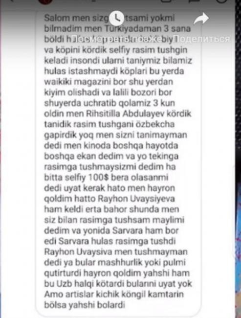 Ijtimoiy tarmoqlarda akter Rihsitilla Abdullayevning muhlisi uning ustidan shikoyat qildi. Ta’kidlashicha Abdullayev undan selfi tushish uchun 100 dollar so‘ragan.