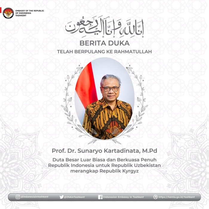 Indoneziyaning O‘zbekistondagi elchisi kecha Toshkentda vafot etdi. Bu haqda Elchixonaning ijtimoiy tarmoqdagi sahifasida xabar berildi.