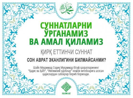 Ya’ni, nimaga soningni ochib o‘tiribsan, berkit, deganlar. Shundan son ham avrat ekanligi va avrati ochilib qolgan, boshqa noshar’iy holatdagi odamlarga tanbeh berish lozimligi kelib chiqadi.