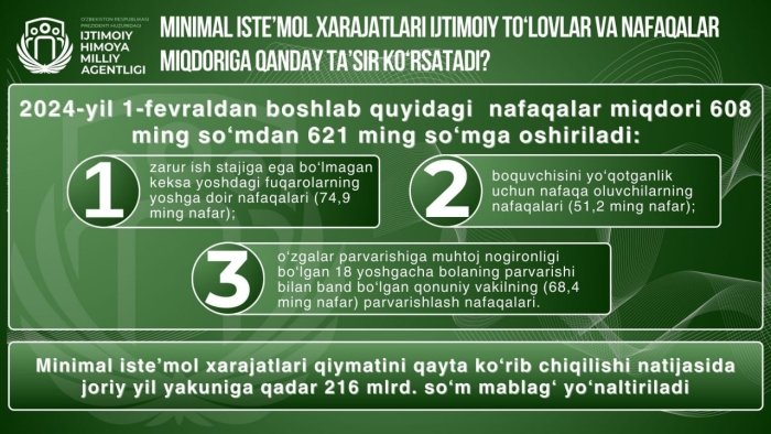 2023 yil inflyasiya darajasidan kelib chiqib, 2024 yil uchun hisoblangan minimal iste’mol xarajatlari qiymati bir oyda kishi boshiga 621 ming so‘m etib etib e’lon qilindi.