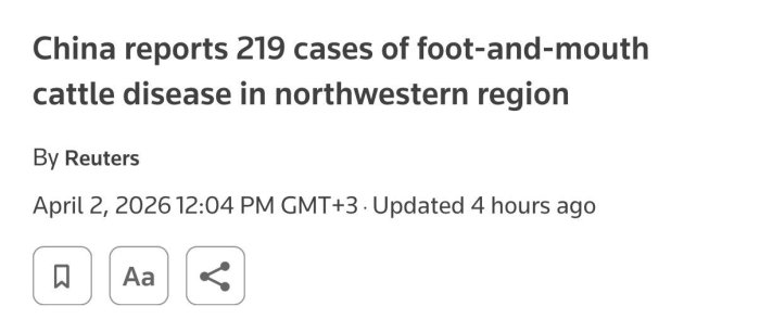 Хитойда илк бор ўта хавфли SAT1 туридаги вирус штамми аниқланди — касаллик Россиянинг чегара ҳудудларида тарқалмоқда.