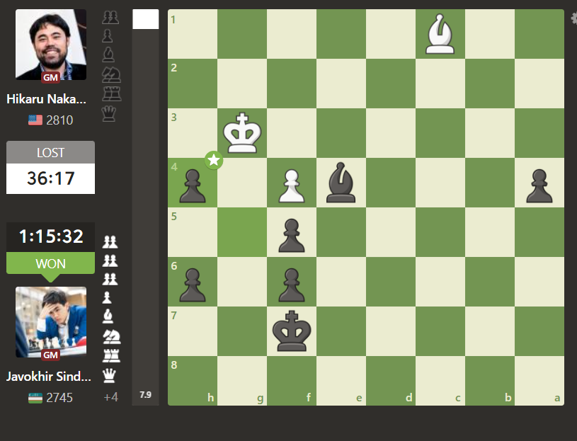 Xikaru uchun bugungi bahsda g‘alaba qozonish katta ahamiyatga ega ekanini inobatga olib, hujumkor o‘yin uslubini tanladi. Xikaru o‘yin boshida 2 ta piyodani qurbon berib, hujumkor vaziyatni qo‘lga kiritib, Javohir oldiga muammolar qo‘ya boshladi. Sindarov esa raqibning barcha hamlalarini juda katta aniqlikda bartaraf etib, endshpilda katta ustunlikka ega bo‘ldi. Natijada Nakamura 41-yurishda o‘z mag‘lubiyatini tan oldi.