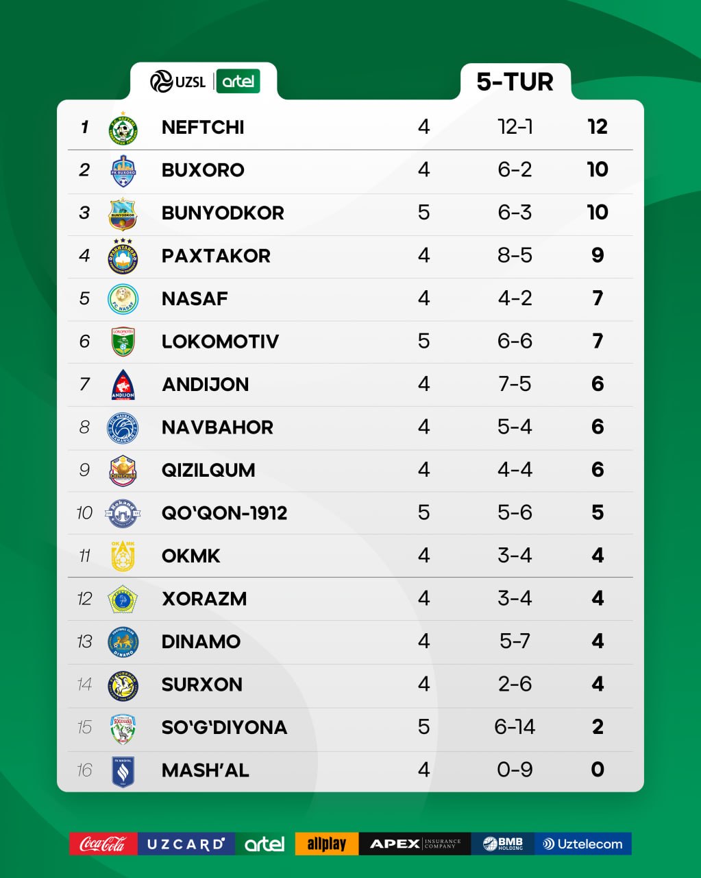 Superliga. 5-turning dastlabki ikki o‘yinidan so‘ng turnir jadvalidagi holat bilan tanishing (foto)