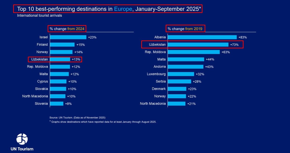 Butunjahon turizm tashkiloti (BMT Turizm) tomonidan e’lon qilingan so‘nggi tahliliy ma’lumotlarga (World Tourism Barometer) ko‘ra, O‘zbekiston 2025-yilning yanvar–sentyabr oylarida xorijiy sayyohlarni jalb qilish bo‘yicha dunyo miqyosida eng yuqori o‘sish qayd etilgan TOP-7 davlatlar qatoriga kirdi. Xususan, mamlakatga tashrif buyurgan xalqaro turistlar oqimi 2019-yil darajasiga nisbatan 73 foizga oshib, O‘zbekistonning global turizm makonidagi mavqei izchil mustahkamlanib borayotganini ko‘rsatdi.