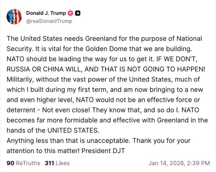 АҚШ президенти Доналд Трамп Гренландияни АҚШ миллий хавфсизлиги учун стратегик аҳамиятга эга деб атаб, уни қўшиб олиш зарурлигини билдирди.
