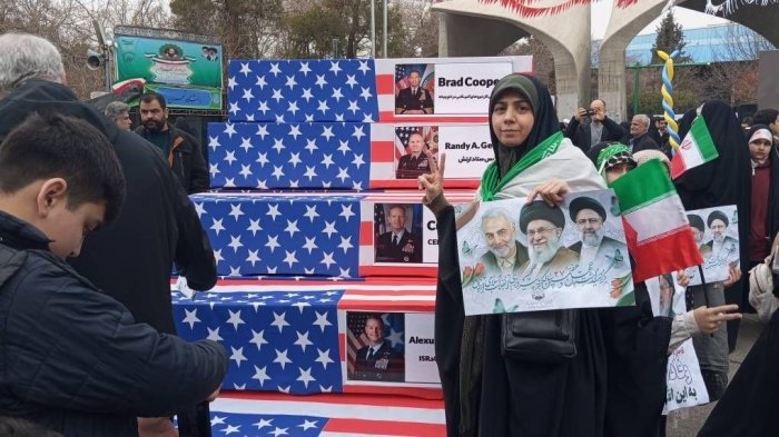 Эрон Ислом инқилобининг 47 йиллиги муносабати билан Теҳронда ўтказилган юриш чоғида АҚШ армияси қўмондонлари ва генераллари сурати туширилган сохта тобутлар намойиш этилди.