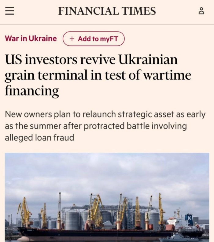 Нашрнинг ёзишича, Қўшма Штатларнинг Argentem Creek Partners ва Innovatus Capital Partners инвестиция фондлари Одесса портидаги Olimpex дон терминали устидан назорат ўрнатишга эришган. Бу гаровга қўйилган дон билан боғлиқ фирибгарлик бўйича узоқ давом этган суд жараёнларидан сўнг юз берган.