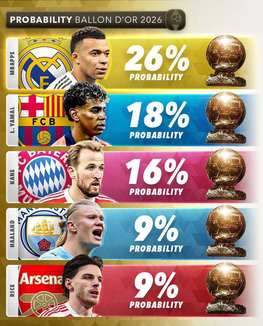 "Барселона"нинг 18 ёшли испаниялик юлдузи Ламин Ямал 18 фоиз имконият билан иккинчи, Харри Кейн ("Бавария") эса 16 фоиз имконият билан учинчи ўринда.
