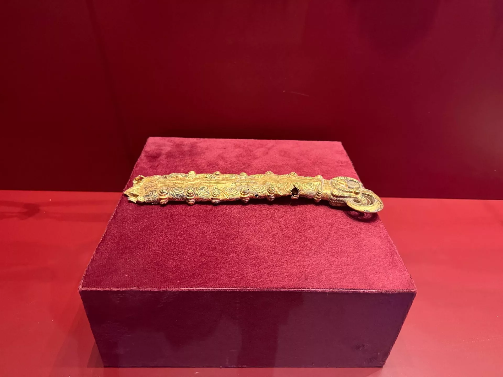 Милоддан аввалги IV асрга оид ушбу ноёб экспонат Аҳамонийлар даври ва Искандар Македонский юришлари билан боғлиқ тарихий жараёнларни акс эттиради. Қин юзасидаги ҳайвонлар ва афсонавий образлар сак, суғд ва бақтрия санъати анъаналарининг уйғунлигини намоён қилади.
