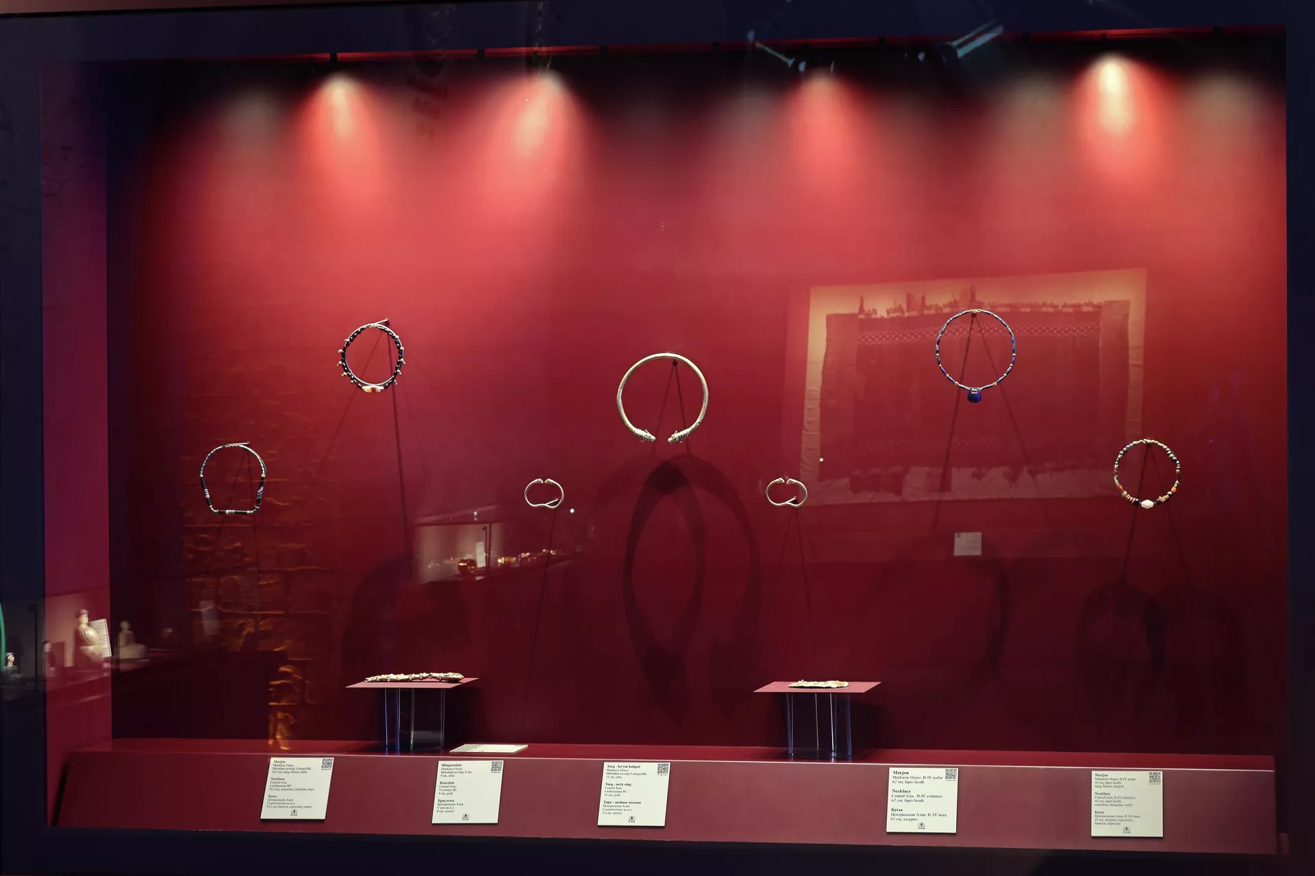 Олтин найча шаклидаги мунчоқлар, лочинтош, ақиқ ва ферузанинг уйғунлиги Бақтрия заргарлик санъатининг юксак даражасини кўрсатади. Бу тақинчоқлар қадимда эстетик қиймат билан бирга маросимий ва руҳий аҳамиятга эга бўлган.