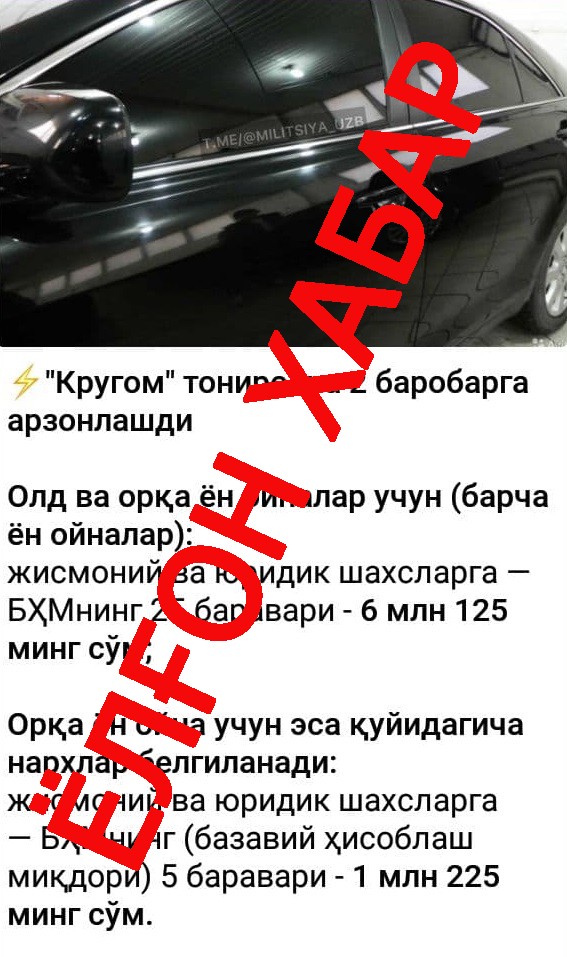 - М2, М3 тоифага оид III класс автотранспорт воситалари ён ойналарининг тусини ўзгартиришга (қорайтиришга) рухсатнома бериш учун тўлов ставкалари уларнинг эгалари ҳуқуқий ҳолати инобатга олинган ҳолда ушбу банднинг «в» кичик банди учинчи хатбошисига мувофиқ белгиланади” – дея кўрсатиб ўтилган. Ушбу қарор талаблари айни вақтда амалда бўлиб, ижтимоий тармоқларда тарқатилган хабарлар асоссиз маълумот ҳисобланади.