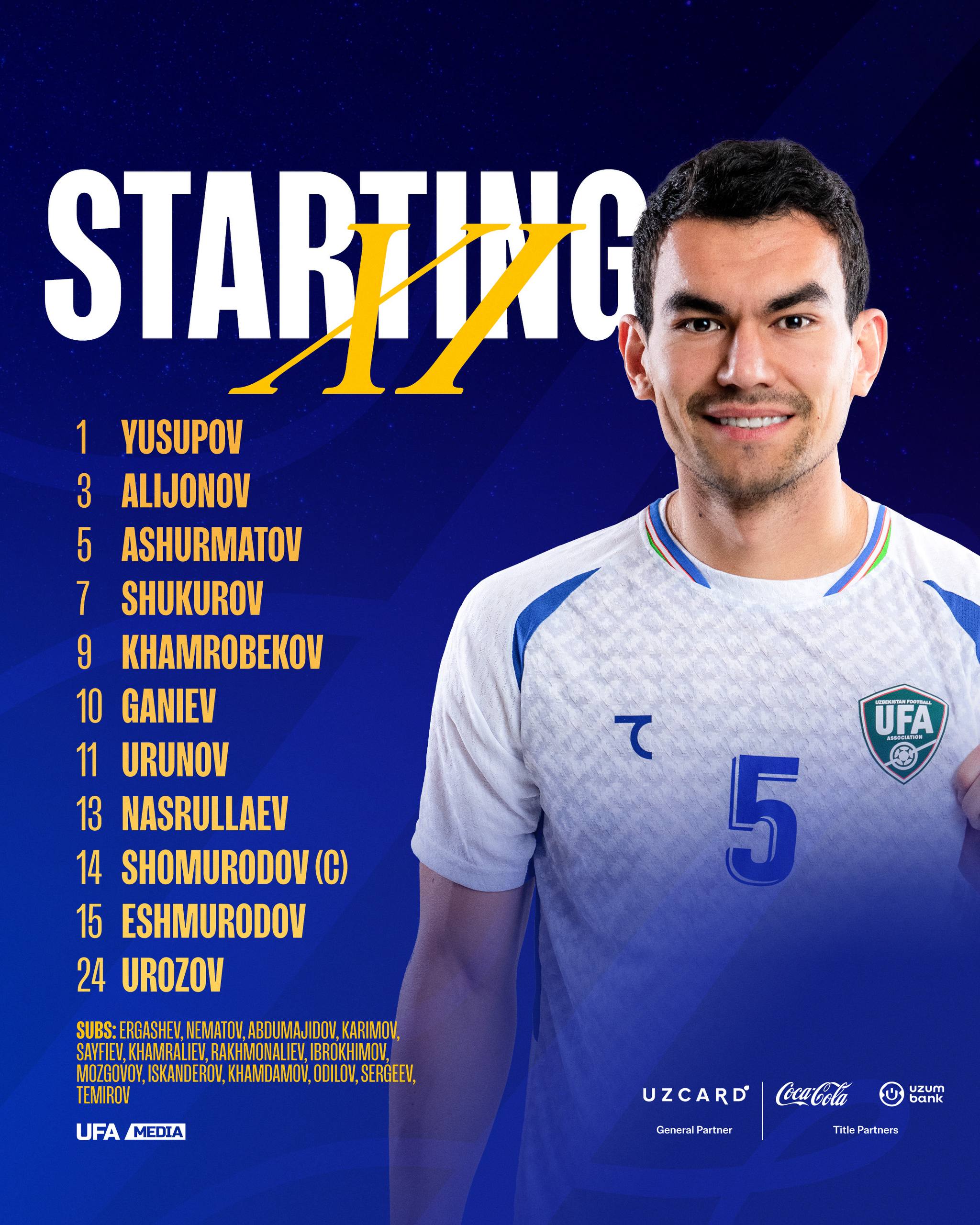 Тошкент вақти билан 19:00 да старт оладиган учрашув учун вакилларимизнинг асосий таркиби маълум бўлди.